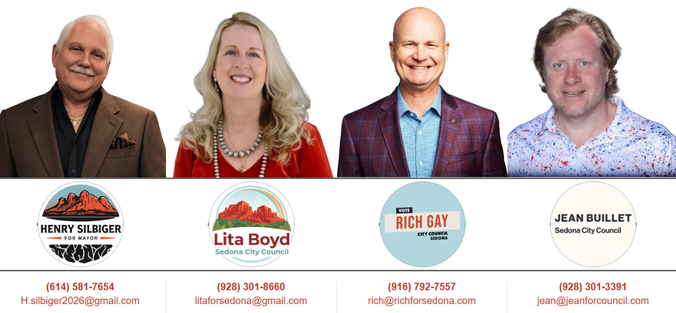 Sedona City Council & Mayor 2026Sedona Residents FirstSlate 4 ChangeTo Make a Change, Vote for all 4! Website Website Website Website Website Website Website Website Sedona Residents First – Slate for ChangeHenry Silbiger for Mayor Lita Boyd Rich Gay Jean BuilletPaid for by Sedona Residents First